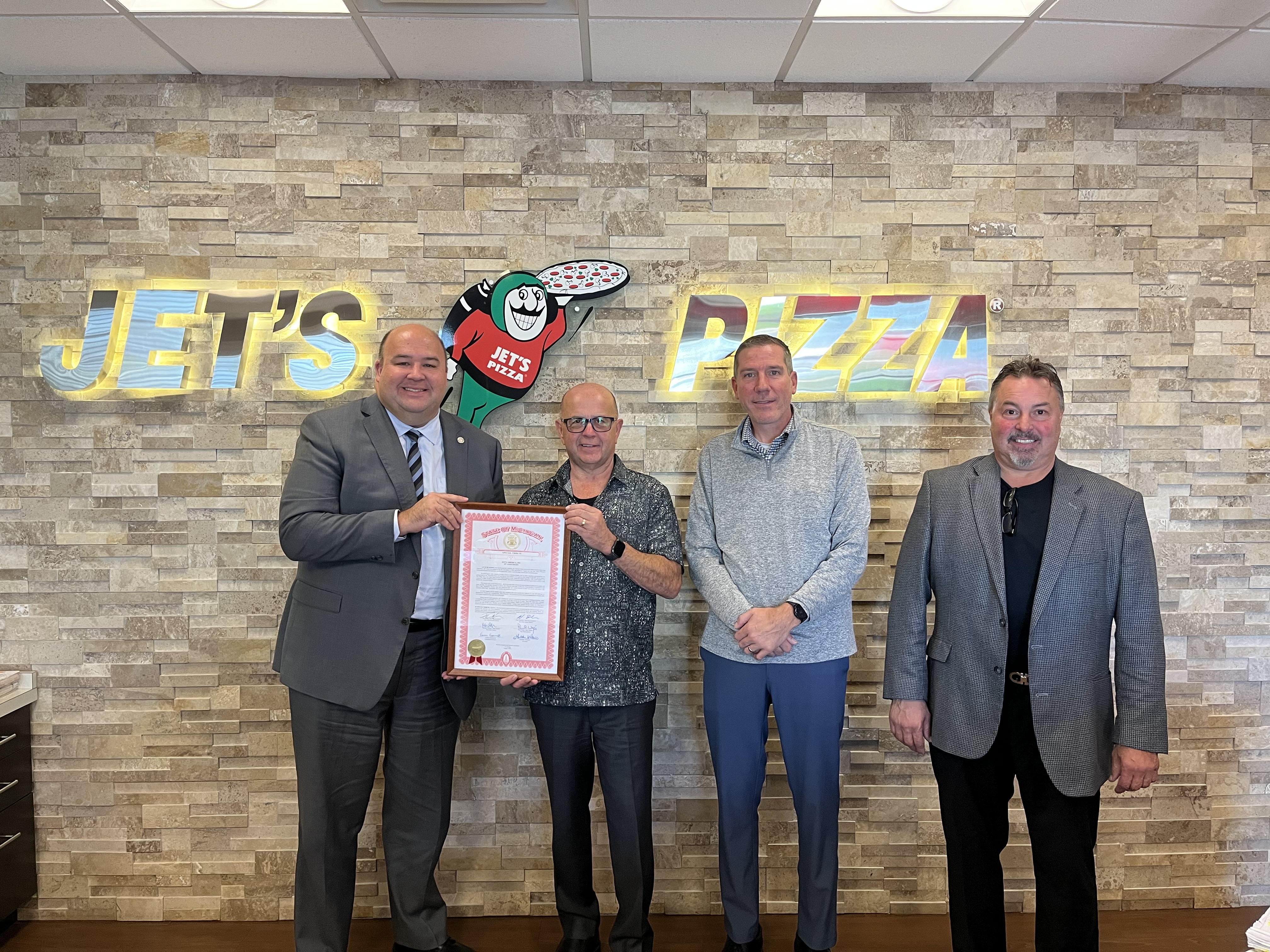 LANSING, Mich. — Sen. Michael Webber (left), R-Rochester Hills, on Monday presented a legislative tribute to Jet’s Pizza CEO John Jetts (center left) and Vice President of Store Operations Jeff Galloway (right) along with state Rep. Nate Shannon (center right), D-Sterling Heights, in celebration of the company’s 45th anniversary.