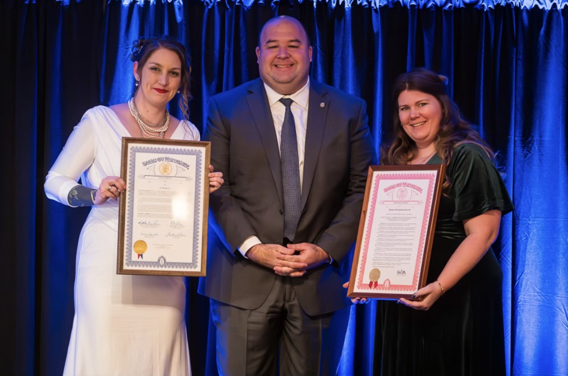 LANSING, Mich. — On Feb. 24, state Sen. Michael Webber (center) presented Junior Chamber International (JCI) Michigan 99th President Carena Townsend (right) and 100th President Michelle McGrann (left) with Senate Resolution 97 and a legislative tribute honoring the organization’s 100th anniversary during its annual Year-End Celebration.