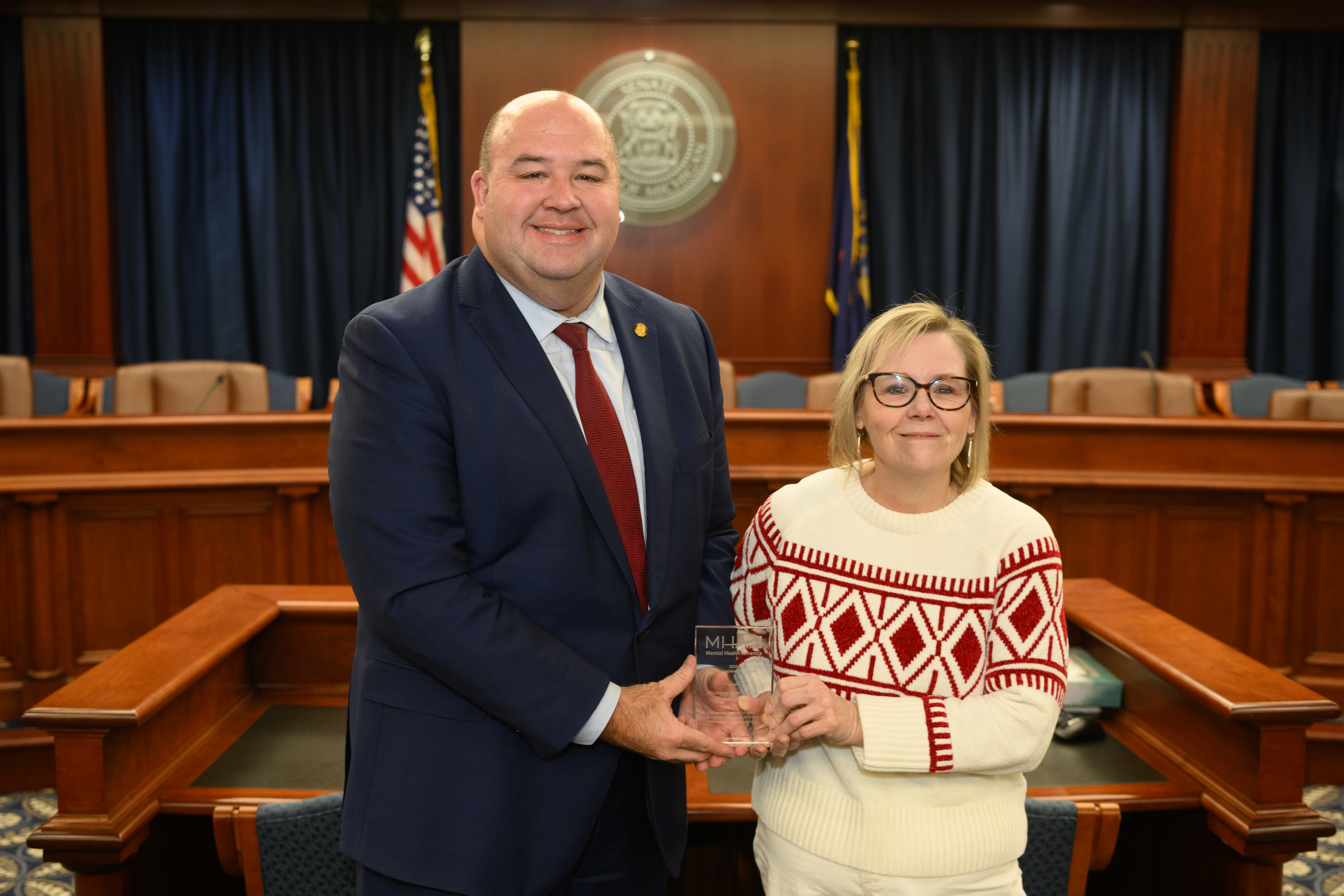 Photo caption: Sen. Michael Webber, R-Rochester Hills, stands with Marianne Huff, president and CEO of the Mental Health Association in Michigan after being presented with the 2025 State Legislative Champion Award.